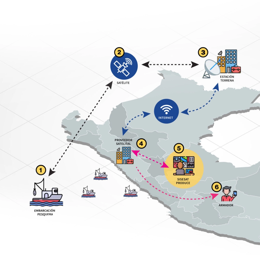 - 4-5 | El proveedor satelital reenvía la señal de posición al Centro de Control del SISESAT (PRODUCE).